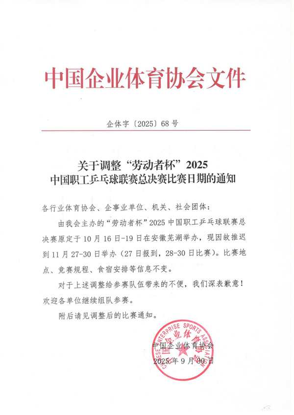 关于调整2025中国职工乒乓球联赛总决赛日期的通知
