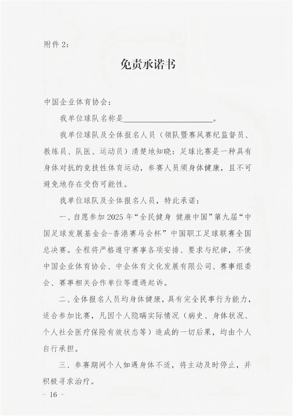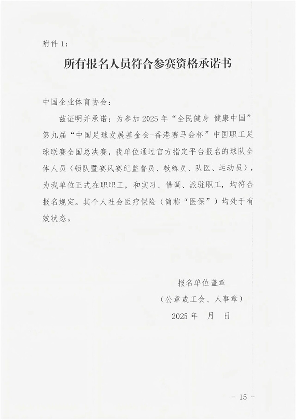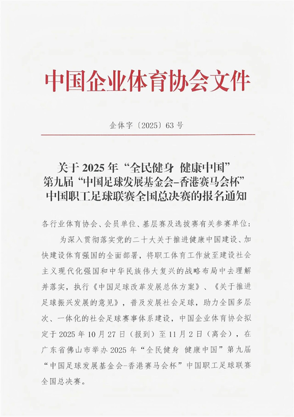 1、关于2025年“全民健身 健康中国”第九届“中国足球发展基金会-香港赛马会杯”中国职工足球联赛全国总决赛的报名通知
