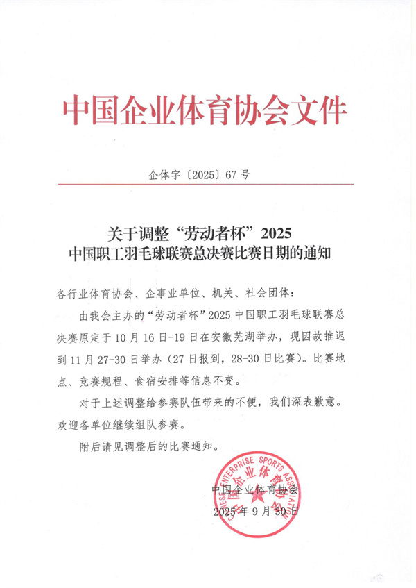 关于调整2025中国职工羽毛球联赛总决赛日期的通知